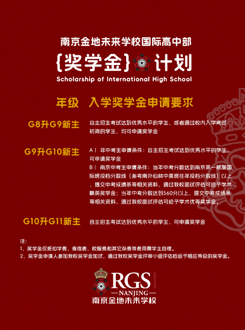 B丨 南京中考生申请条件:当年中考分数达到南京第一梯度国际班投档分数线(参考南外仙林中美班往年投档分数线)以上,提交中考成绩条等相关资料,通过我校面试评估可给予学术精英奖学金;当年中考分数达到560分以上,提交中考成绩条等相关资料,通过我校面试评估可给予学术优等奖学金。