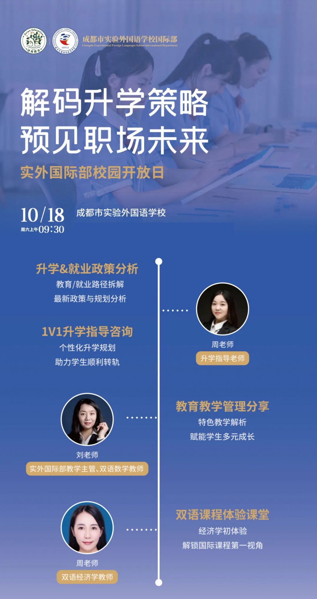 活动当天,成实外国际部资深升学指导老师,将从海外本科升学的最新政策及规划出发,从如何转轨、转轨后如何规划高中阶段的发展、如何取得理想海外院校的录取、在本科阶段如何规划后续的职业发展等方向,为目标海外本科升学的学生提供专业建议。