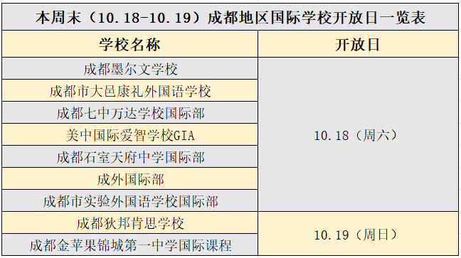 以上就是《本周末(10.18-10.19)成都地区国际学校开放日汇总!》介绍。国际教育前线,从业十年,专业的国际学校择校服务平台。全国国际学校一站式择校服务,规划目标学校入学备考方案。快速了解您所在地域国际学校排名、学费、入学条件、校园开放日,欢迎在线预约咨询或者电话:4006-196-100
