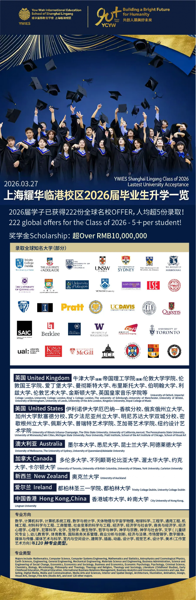 自2015年建校以来,上海临港耀华校区历届毕业生持续斩获亮眼升学成果,人均收获超过5封世界知名院校录取通知书,累计获得奖学金总额突破3000万元人民币。