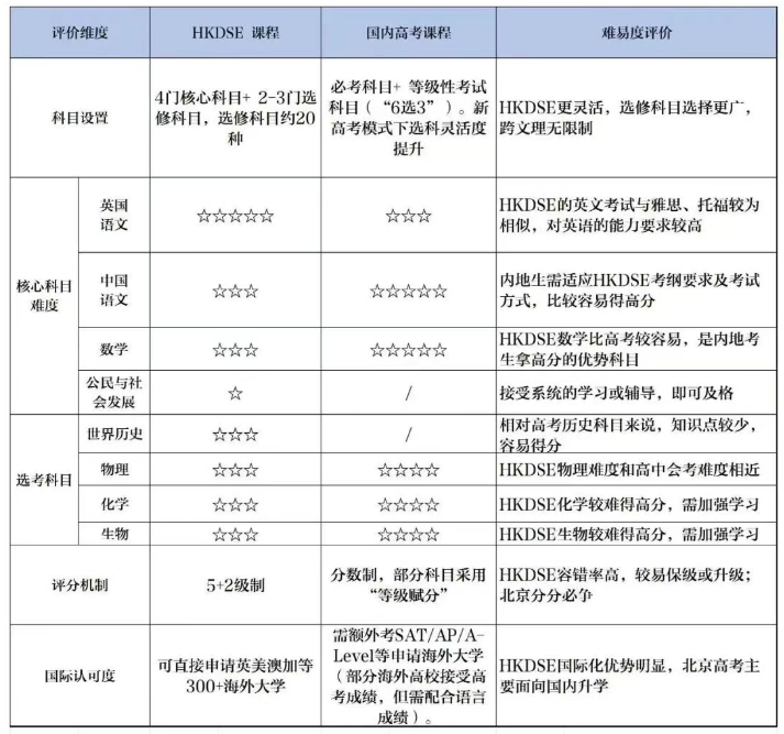 HKDSE考试整体难度低于内地高考,容易取得高分,无论大学录取率或申请名校的机会,都有绝对优势。目前进入“香港三大”(香港大学、香港中文大学和香港科技大学)的最低HKDSE分数大概5科总成绩在23至28分左右。