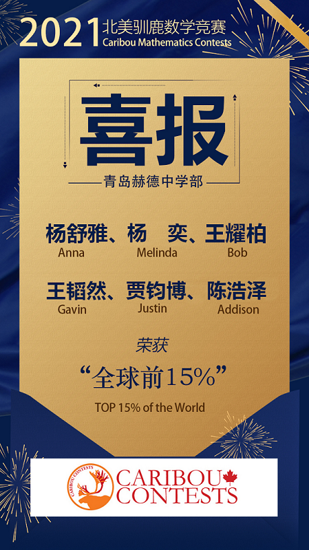 近日,青岛赫德中学部再创佳绩!在刚刚结束的北美驯鹿数学竞赛中,青岛赫德中学部的Cici同学获得了同年级段全球第一名的好成绩。同时,青岛赫德中学部的7名同学进入了全球排名前15%。这是继斩获全美经济学挑战赛大奖、世界学者杯大赛等一系列国际赛事之后,赫德学子再次取得的傲人成绩!