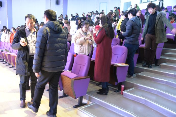 首先,分析了人类无法消除的压力。指出压力是大脑的一种反应,现场与全体老师展开了互动,全体老师起立,两两一组进行了拍手的活动,以此活动分析了老师们不懂得压力反应。接下来为大家讲解了职场人士的各种压力来源。通过心理学的图片测试了大家的压力等级。