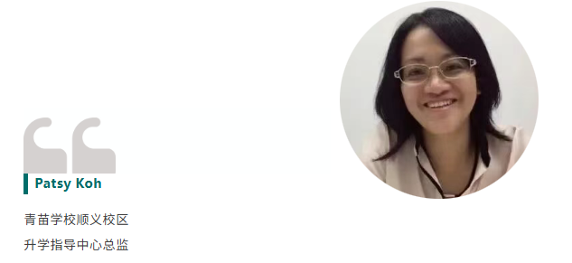 · 成果转化:Patsy Koh主任20年新加坡顶尖学府的升学指导经验,将为青苗学子的成长之路提供最可靠的保障。