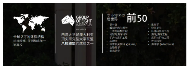 “澳八大”之一的西澳大学在科学、医学、工程等领域具有强大的研究实力。西澳大学不仅13个学科稳居世界前50,还坐拥全球顶尖矿产资源。