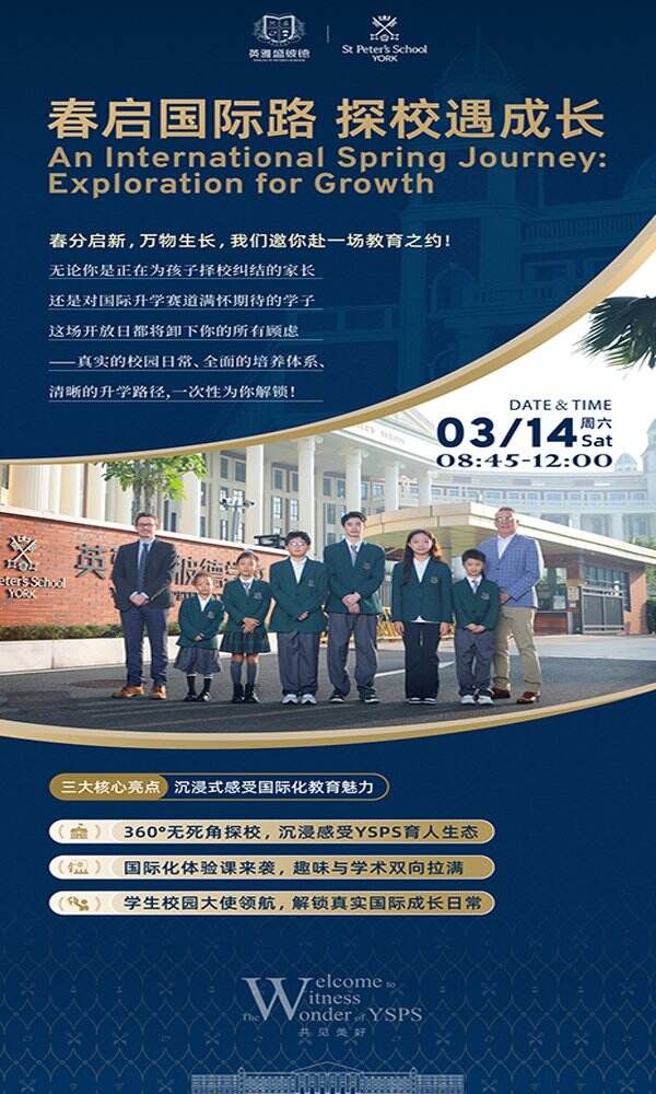 海南英雅圣彼德国际学校校园开放日 一、活动核心概况 活动主题:春启国际路 探校遇成长活动时间:3 月 14 日(周六)08:45-12:00邀约对象:为孩子择校纠结的家长、对国际升学赛道有期待的学子 二、活动核心价值 本次开放日将一次性为参与者解锁学校核心信息,打消择校顾虑,具体包括:真实的校园日常、全面的培养体系、清晰的升学路径。 三、三大核心亮点