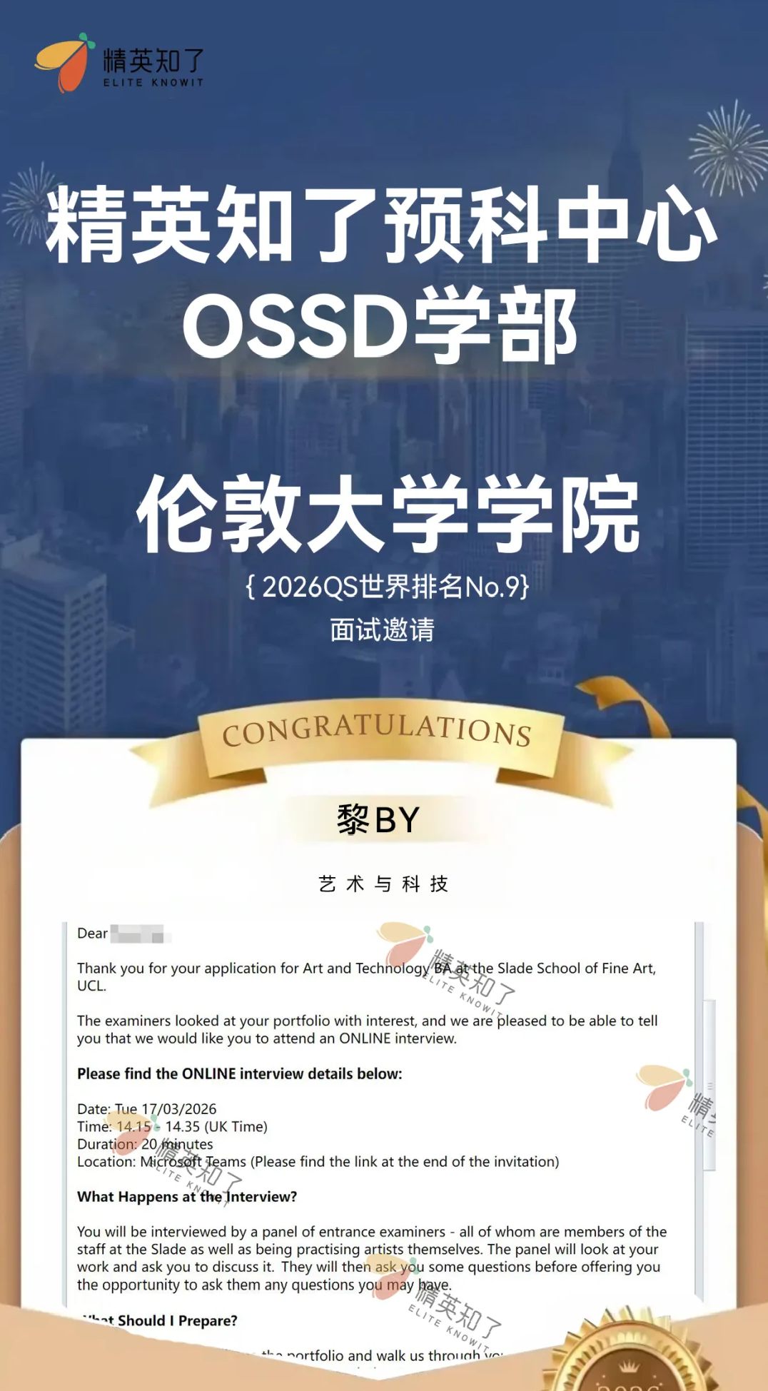 该专业每年全球仅招收约15名学生,竞争异常激烈,是精英知了学子在该专业历史上获得的首封录取,标志着在该顶尖特色专业的申请上取得了重大突破。